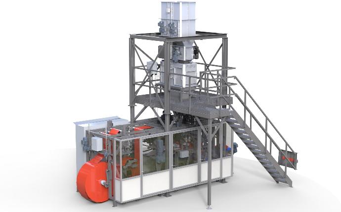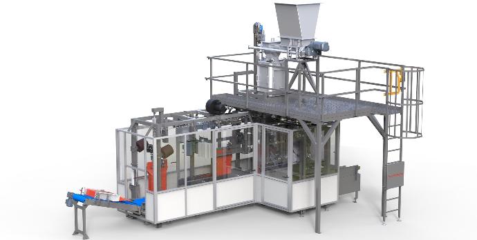 The VLA bag filling machine can fill open mouth bags up to 1200 bags/hour. The empty bag is picked up from the bag magazine and presented to the spout by two arms. This bagging and filling machine is designed to place the bags one behind the other, allowing a very small footprint.